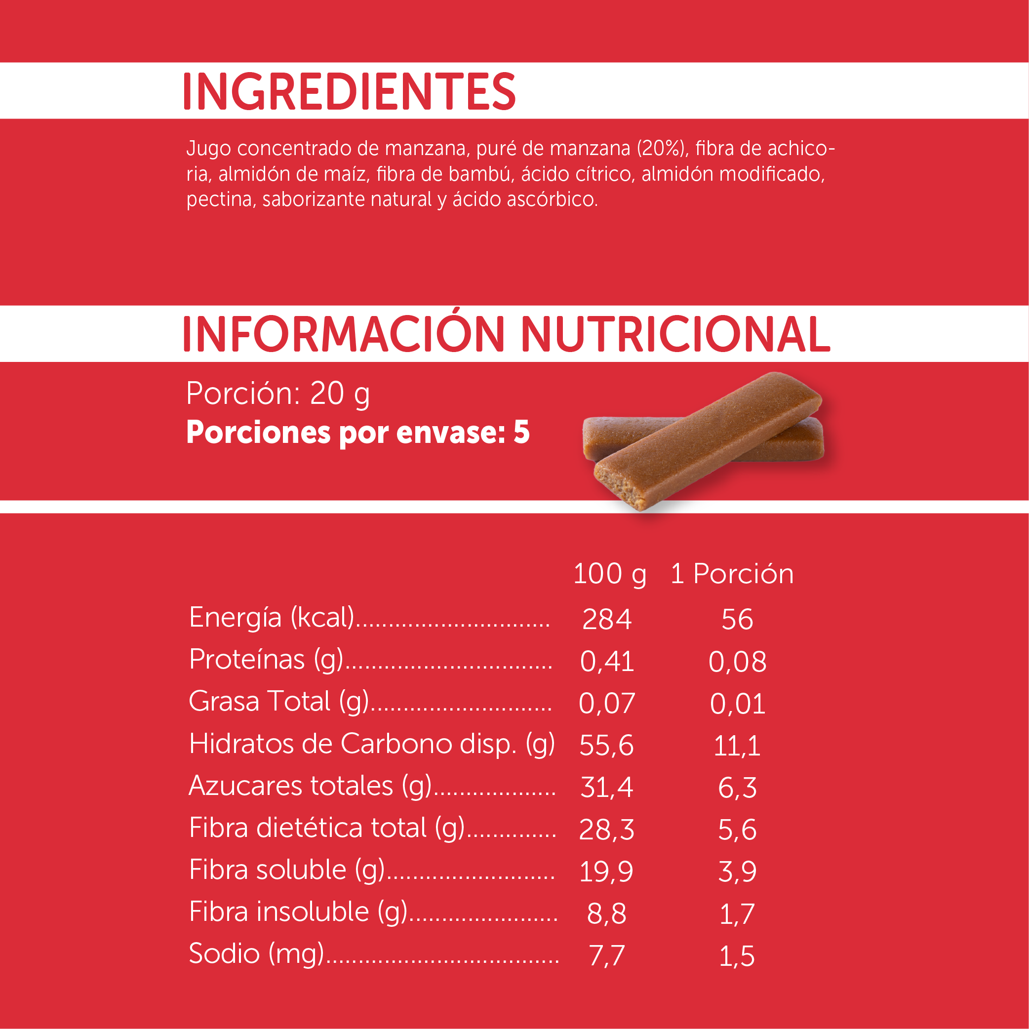 Nuestros sticks de frutas son un colación rica y nutritiva, excelente fuente de fibra y libre de sellos. Sin azúcar añadida, son ideales para niños y para compartir con toda la familia. Cada caja master contiene 18 estuches de 5 unidades de 20 gramos (90 sticks en total), el tamaño perfecto para llevarlo contigo a donde vayas. También, ¡una opción inmejorable para las colaciones de los más pequeños entre clases!
